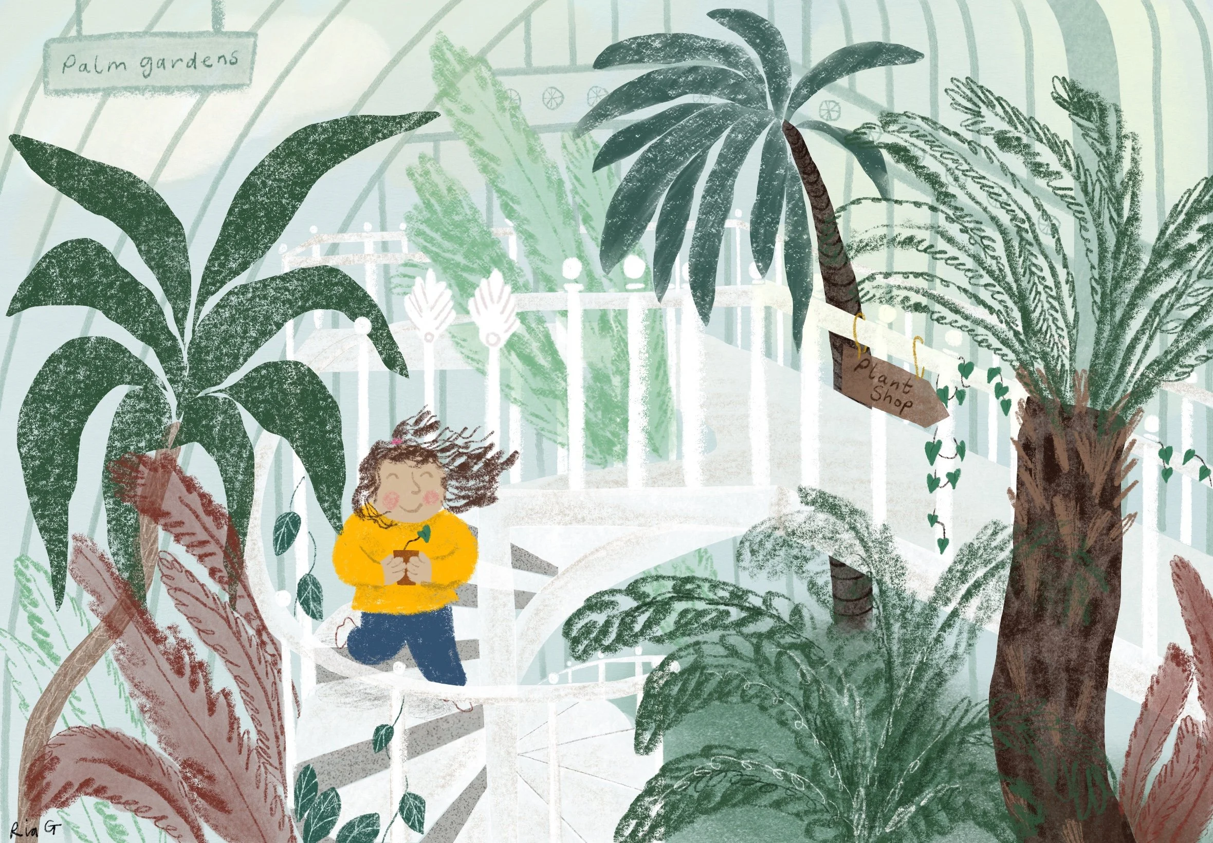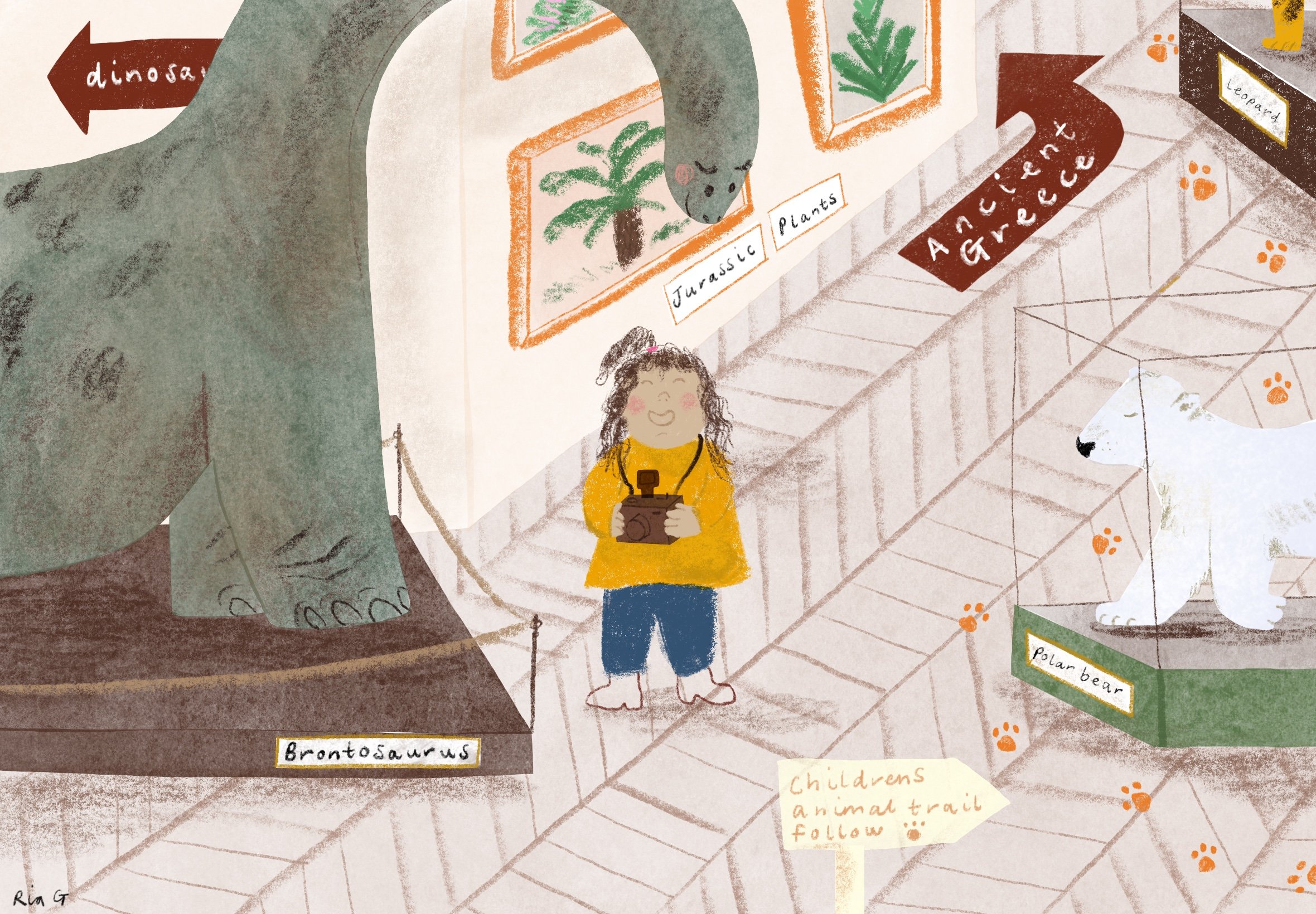A series of illustrations following a little girl exploring fun and exciting places, discovering lots of new things and making new friends.